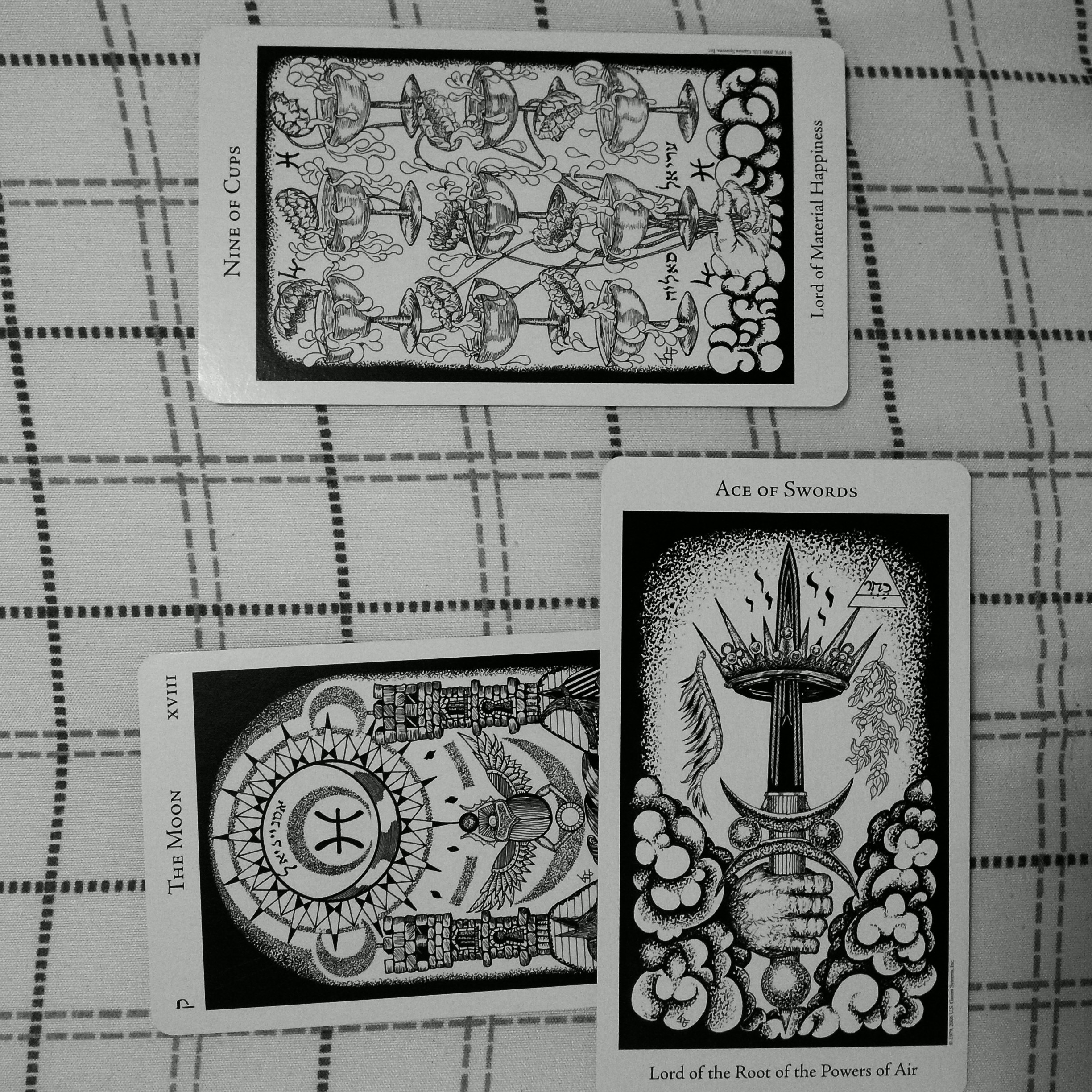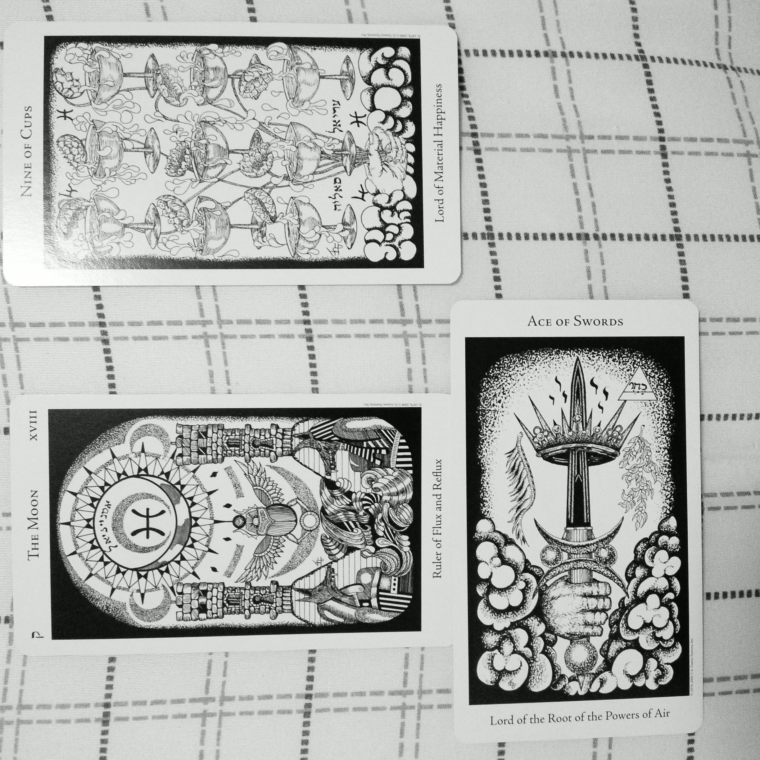 Yesterday’s draw was The Moon, Ace of Swords, Nine of Cups. Corresponding respectively, the day, influences, and message to carry for the day.