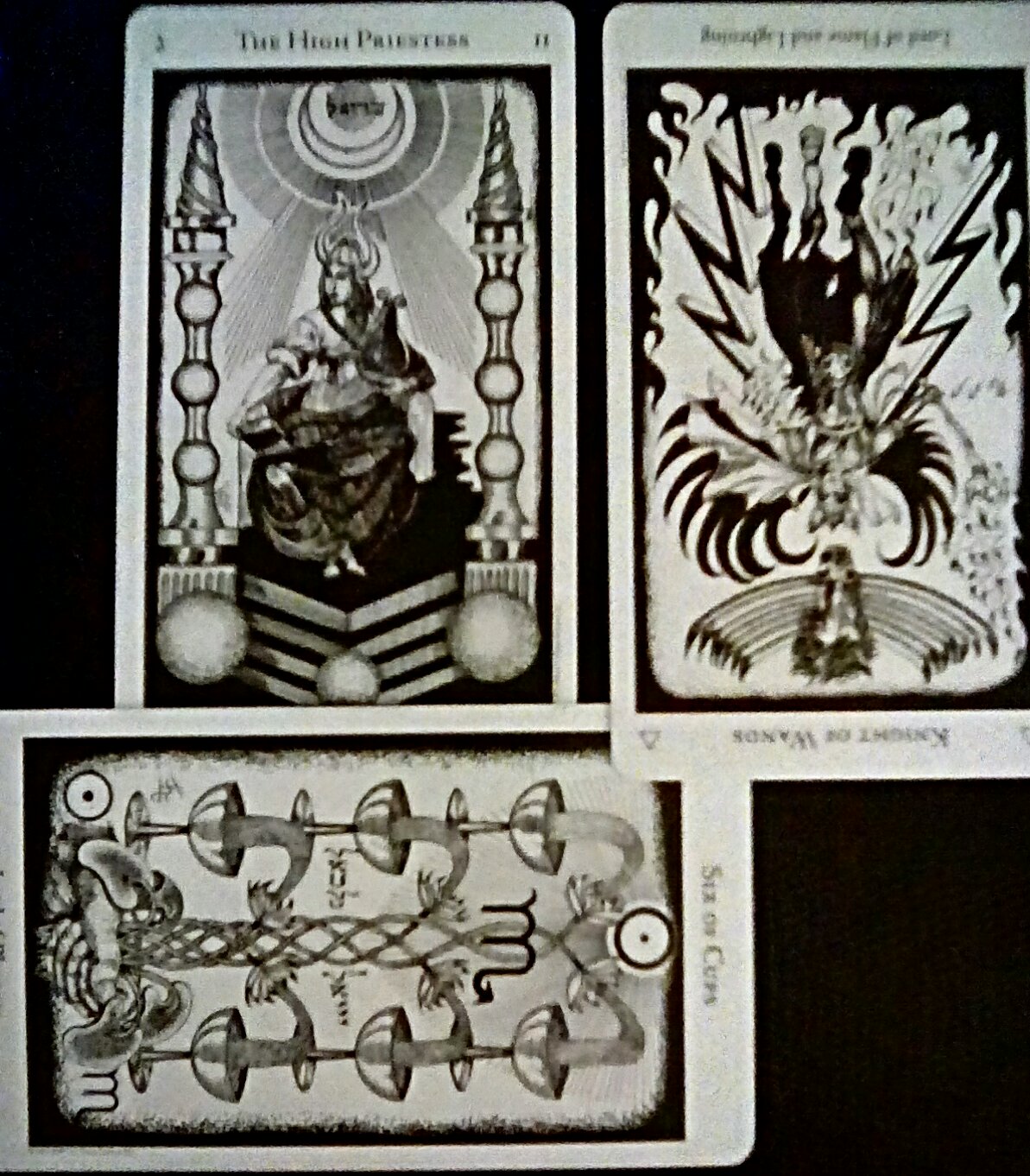 I have before me interconnected cards that in macro show me the state of energetic excess I find myself in, productive, searching, fertile. Since today’s draw is fresher in my mind I will talk about that one, only briefly, I don’t want to ramble on incessantly. Firstly, wow, the description of the High Priestess is beautiful: The moon appears above the seated priestly figure of Isis, The Eternal Virgin. She is adorned in the purest light of the moon; the same light that serves as a veil to hide the moon; the same light that serves as a veil to hide the Eternal Spirit. She holds upon her knee a book, partially concealed by her mantle, which holds the truth behind the veil of light. At her breast she holds a lyre, the law of Artemis, for she is also a Huntress and, like Diana, she hunts by enchantment (LWB). I know, the LWB, I still use it to help me understand the many layers of esoteric info in this deck.