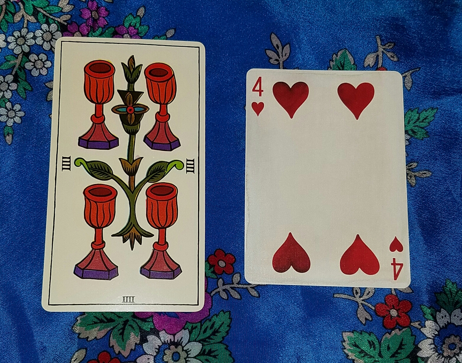 The number four is just plain square, all sides are equal, no corners hidden nor misshapen. This card is about the stability deduced from the square. Grounding emotional stability, connection, practical and established. Nothing surprising here. Yet, if you look at the vines growing between the four cups you see that these qualities also have an underbelly. A negative aspect.