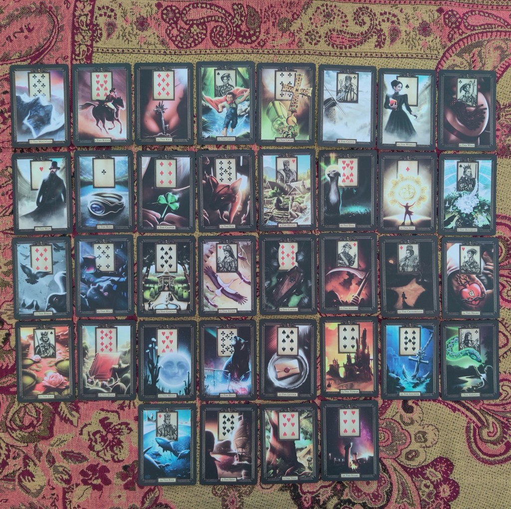 The grand tableau is the most animist of layouts. Along with the more than human, quotidian motifs of the Lenormand oracle, it offers up to the skilled fortuneteller a web of complex relationalities and a process-oriented way of seeing we have almost lost. It is quite literally a jungle (White, pg. 80).