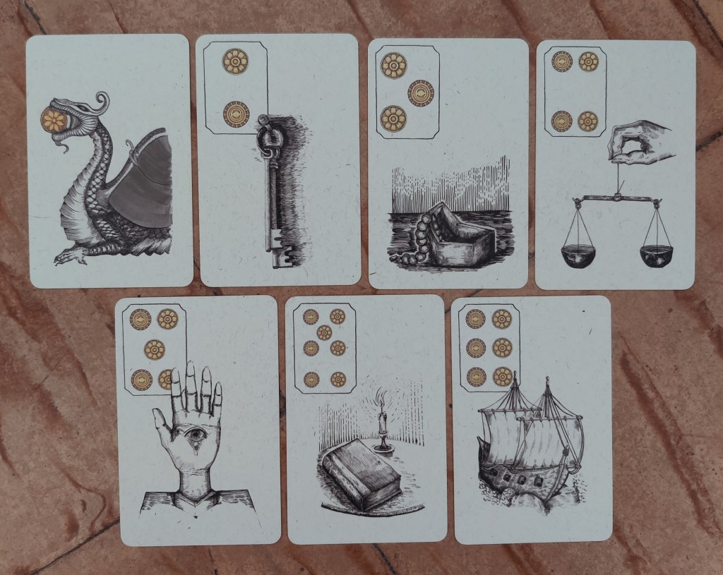 To begin tying the knot on this first part of talking about Cyprian’s deck, I will add a few more words. There are many ways of acquainting oneself with a card deck for fortunetelling, both a long and a short way. We can make our way about the cards, looking for patterns, and building from there a bigger picture, seeking to construct the greater meaning behind the deck itself.