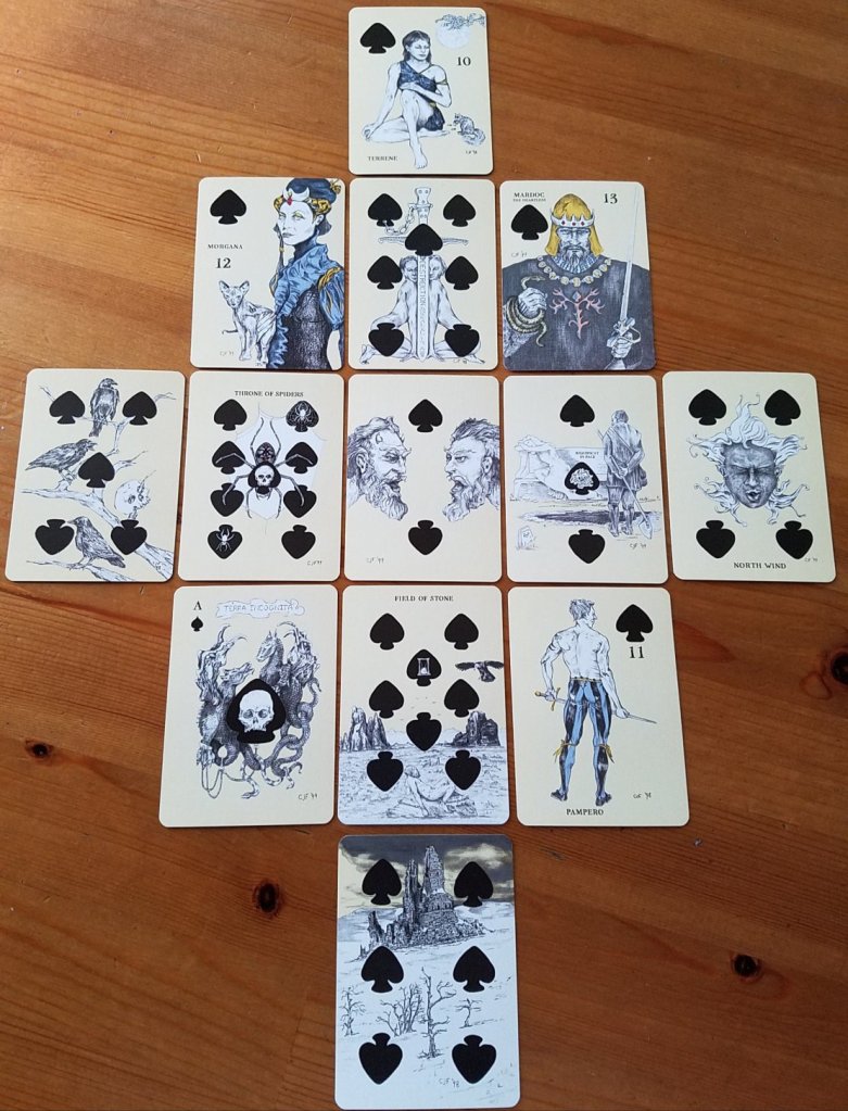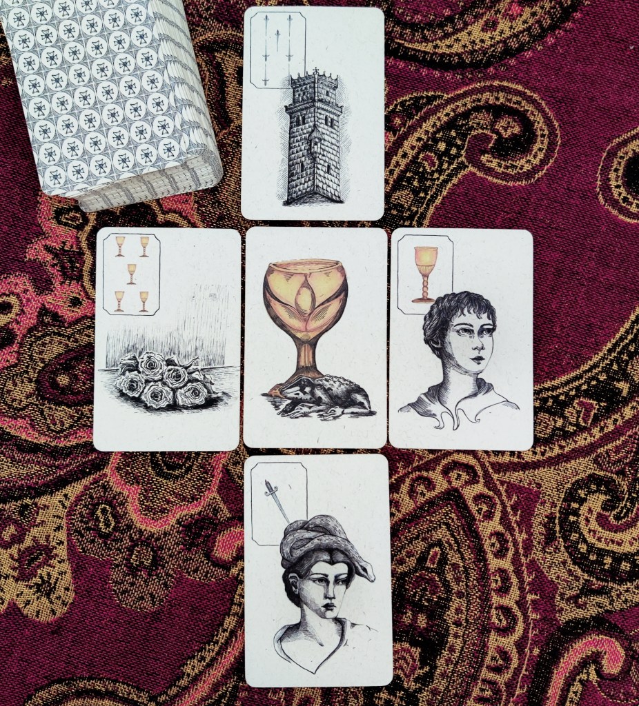 Cyprian Cartomancy: a card reading with a baraja, in a cross spread. I begin reading from the four corners to arrive at the heart, the center. ~30 minutes via video call.